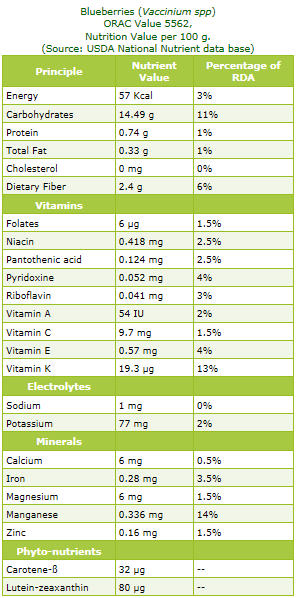 Blueberries help get rid of harmful oxygen-derived, free radicals from the body, thus protecting the body against cancers, aging, degenerative diseases, and infections. These miracle fruits are among the highest anti-oxidant value fruits. The ORAC value of 100 grams fresh blueberry is 5562 TE (Trolex equivalents). Some of the other facts about this great fruit include: